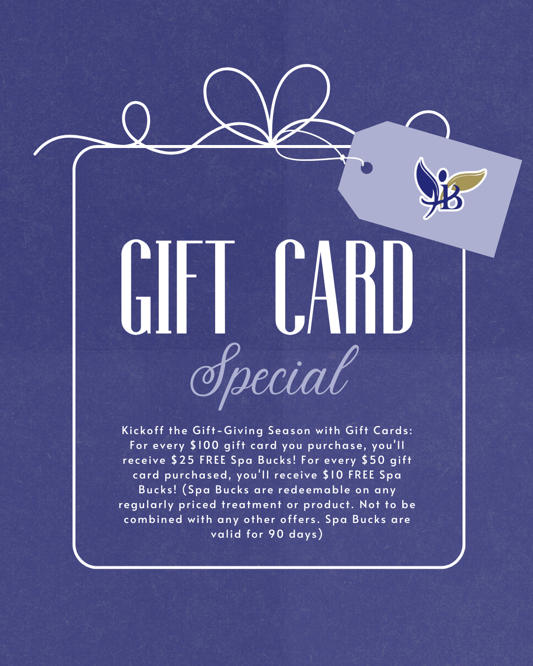 Let the gift-giving season begin! Get FREE Spa Bucks with Gift Card Purchases through Nov. 30 only! Buy a $100 Gift Card and get $25 Spa Bucks. Buy $50 Gift Card and get $10 Spa Bucks. Get your Gift Certificate online or call 540.887.8200 or come see us!